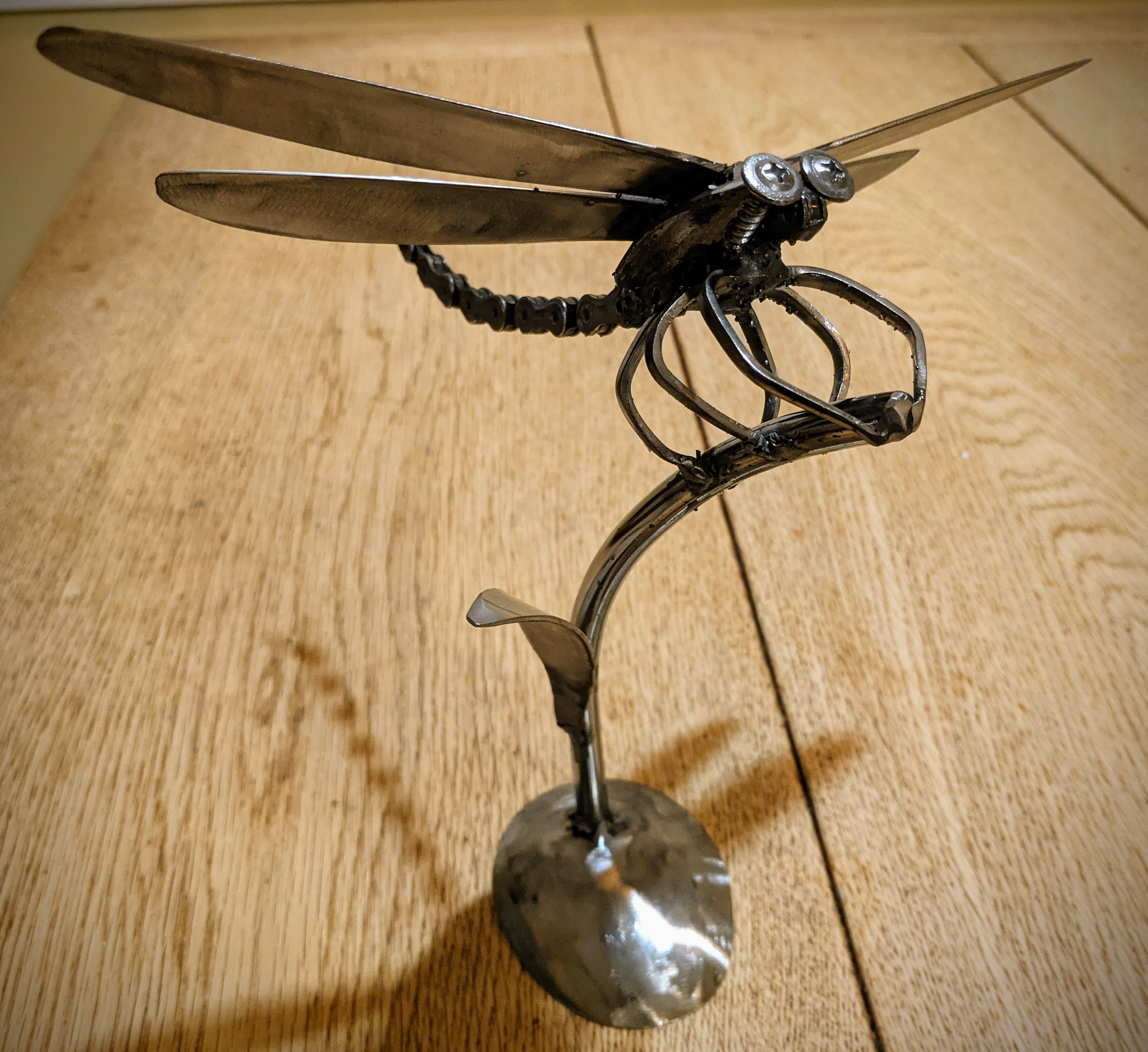 A cutlery Dragonfly sculpture. Made from recycled cutlery and mountain bike chain.