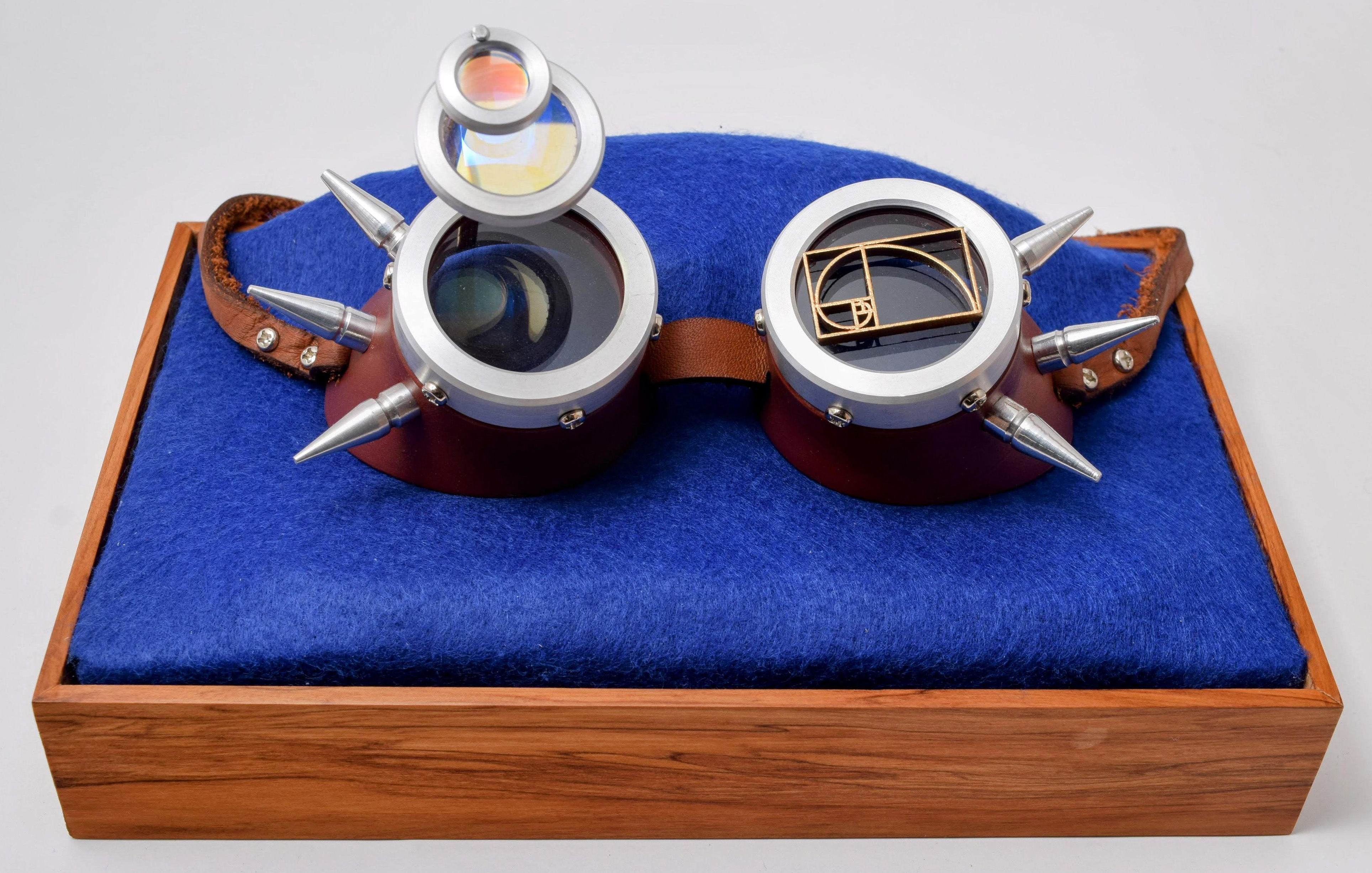 A pair of steampunk goggles I designed and built. My project randomizer came up with “Steampunk”, “Optics”, and “Maths”, and this was the result.