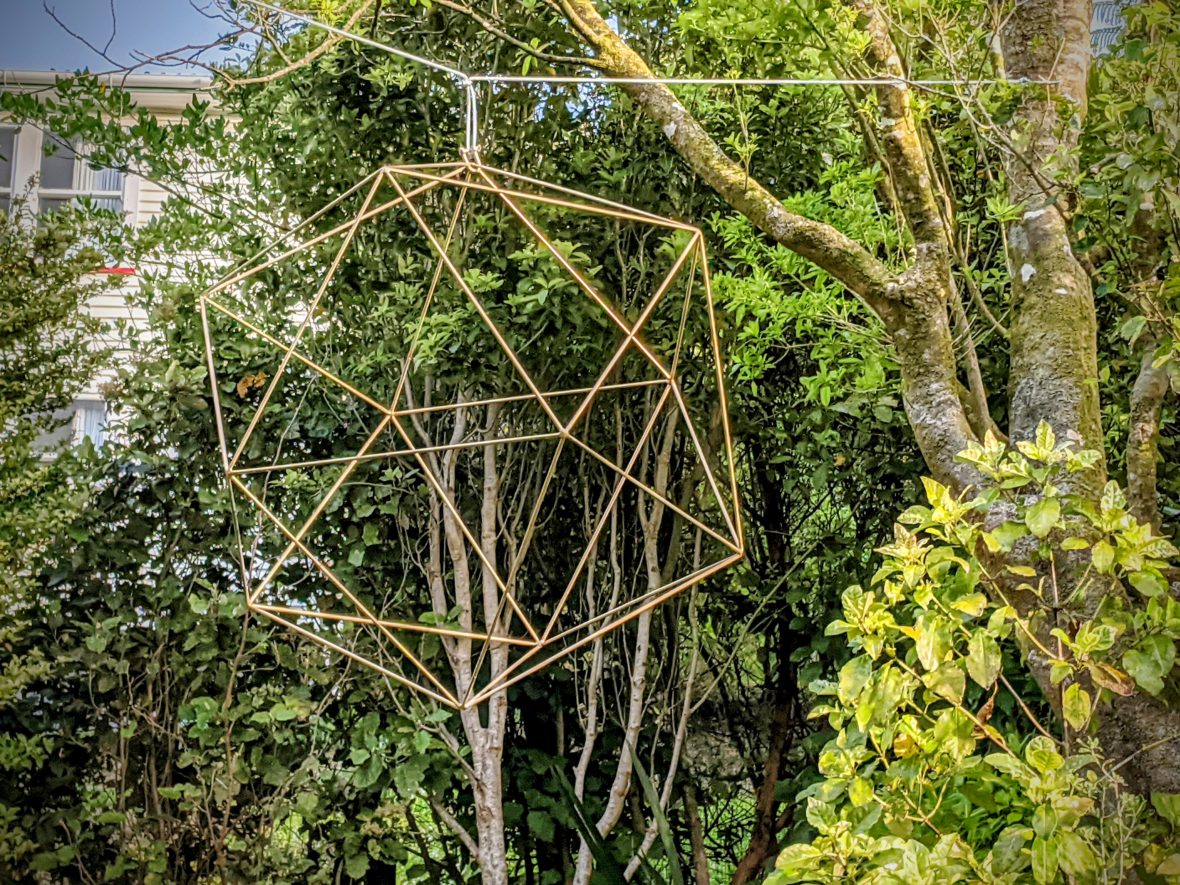 An icosahedron sculpture for the garden made from steel rods - Temporary laser cut holders to secure the edges while welding